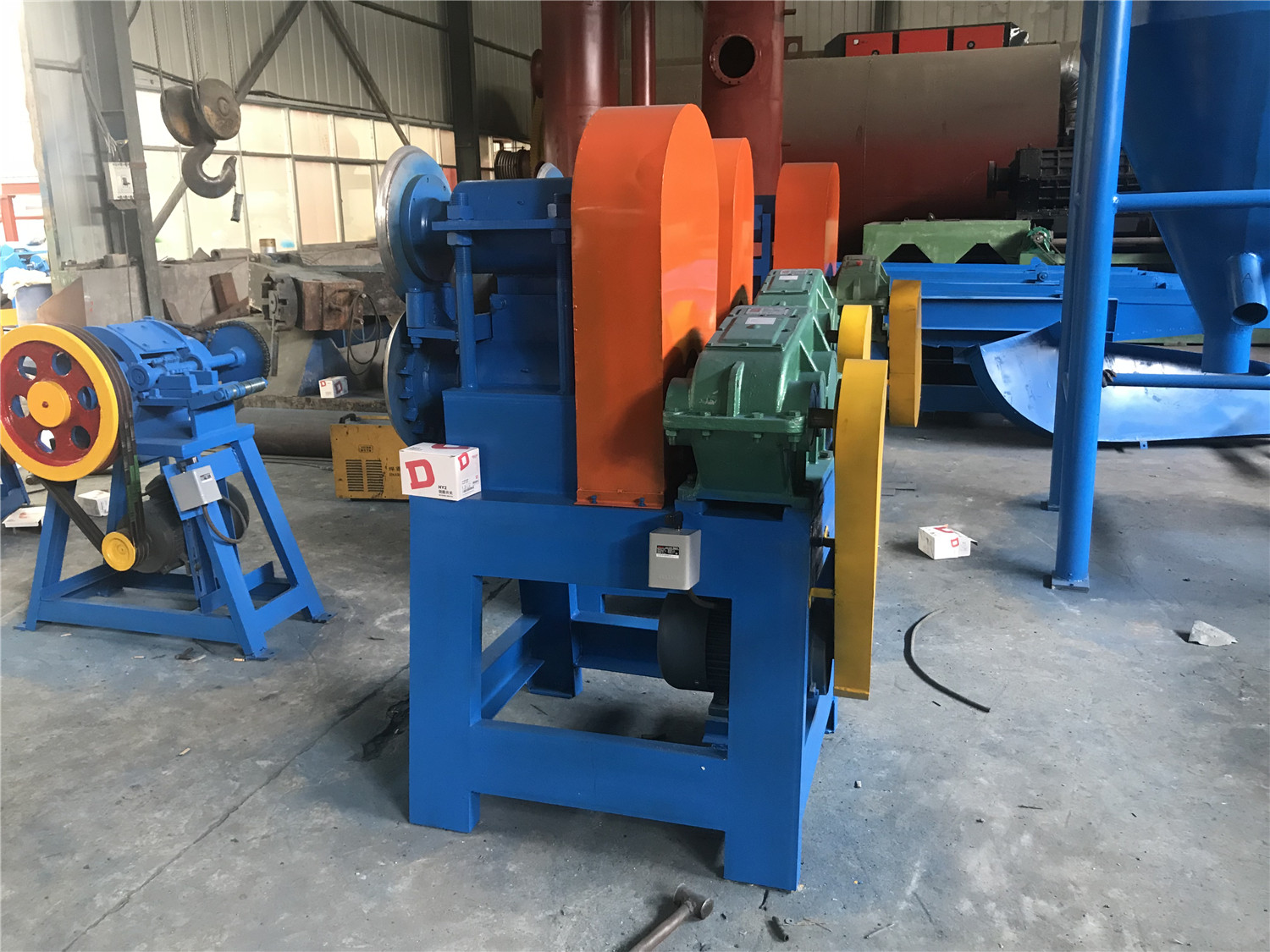 This waste tire recycling machine is the second stage of the tire processing line, used to cut waste tires into long rubber strips after the bead has been removed. The machine uses high-power rotating cutting discs to slice through the tire body with strong precision. It provides clean, even cuts that significantly reduce the material size, preparing it for the next slicing or crushing steps.